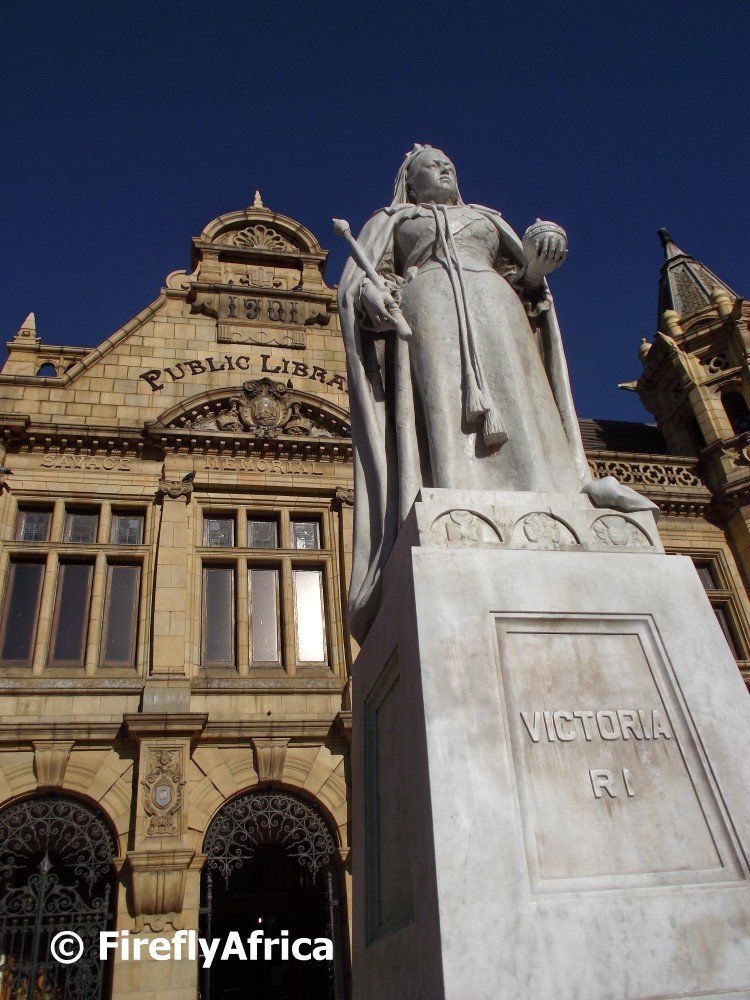 Looking up at the statue of Queen Victoria standing in front of the historic Public Library in the Port Elizabeth city centre.  The statue was unveiled in 1903, one year after the library’s opening.