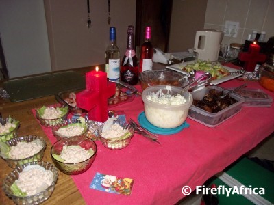 This year we started with prunes wrapped in bacon made in the oven followed by a hake (fake lobster) starter.  The main consisted of gammon, salt beef, beef tongue, Hong Kong Chicken, carrot salad, potato salad, pasta salad and Greek salad with a desert of ice cream with a whole nut chocolate / condense milk sauce.  On Christmas Day we had a braai with the in-laws and Mother-in-law brought her traditional trifle.