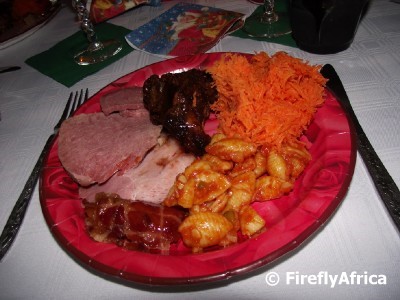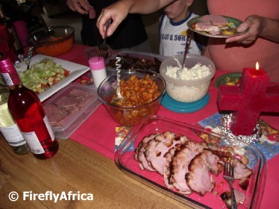 This year we started with prunes wrapped in bacon made in the oven followed by a hake (fake lobster) starter.  The main consisted of gammon, salt beef, beef tongue, Hong Kong Chicken, carrot salad, potato salad, pasta salad and Greek salad with a desert of ice cream with a whole nut chocolate / condense milk sauce.  On Christmas Day we had a braai with the in-laws and Mother-in-law brought her traditional trifle.