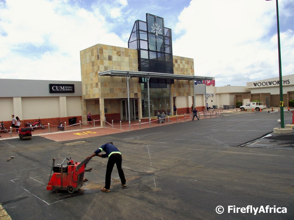 The Walmer Park Shopping Centre in Port Elizabeth recently completed a major upgrade which included an extension of its floor space and the addition of more tenants. One of the final phases of the project is the resurfacing of the parking area which was started before the building industry closed down for their end of year break and was completed last week. I was just wondering why they couldn’t wait for another week for schools to start and did it while there was still lots of cars and shoppers about. Parking was quite hard to find with half the parking lot closed. I have to add though that it was done by the weekend and everything looks quite spiffy now.