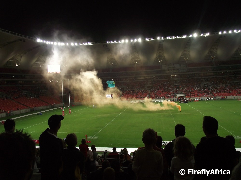 Part of the halftime entertainment during Friday night’s rugby game between the Southern Kings and the Free State Cheetahs was a skydiver landing in the stadium. The guy had everybody on the edge of their seats as it seemed like he just cleared the railing on the top of the stadium roof on his way in. Perhaps that was the way he wanted to do it…