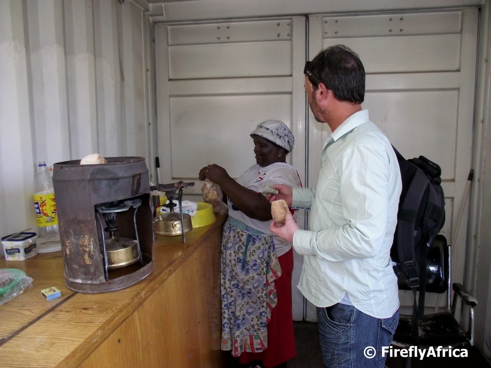 I got to go on a quick trip to the Red Location precinct in New Brighton the other day to see where they are building the new Red Location Backpacker Lodge next to the Red Location Museum.  Some of the ladies who will be involved in the project are being put up temporarily in a container next to the site.  One of the activities that they will be doing is making traditional food for visitors and already they are selling roosterkoek (traditional bread rolls normally made over the coals) to the public from the site. Njam!!!