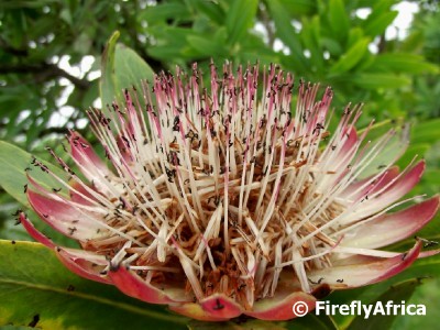 Caroline posted a picture of a protea with a bee in it over the weekend and I thought I should try and go one better. Not the picture itself, but what is in the protea. In this case not just one better, but many little flying insects.