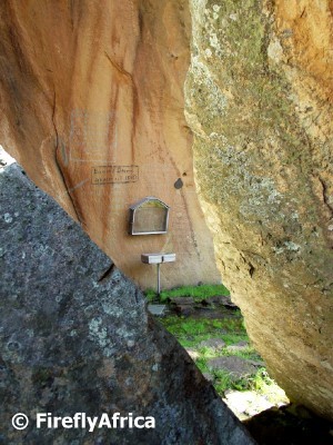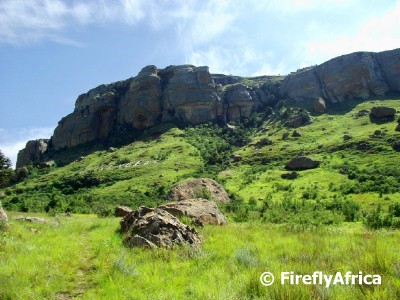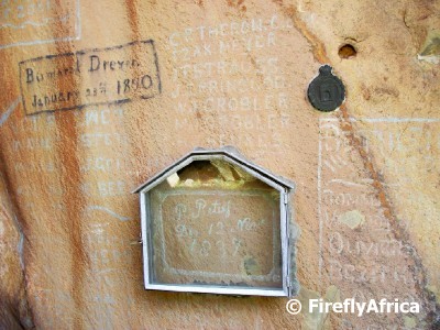 The Great Trek reached this area in 1837 after traveling from the Cape Colony (Eastern Cape and Western Cape) through the Free State.  The Voortrekker put up their laager in the shadow of the mountain in the picture above and a service was held to thank God for protecting them and bringing them this far.  The Voortrekker called the mountain Kerkenberg (Church Mountain).  Upon arriving in the Free State, there was a dispute amongst the Boers as to the final destination of the Great Trek.  One of the main leaders, Piet Retief, chose Natal.  On 7 October 1837 he left the laager with 14 men to scout Natal in advance.  On 12 November 1837, his daughter Deborah painted her fathers name on a rock below Kerkenberg to commemorate his birthday.