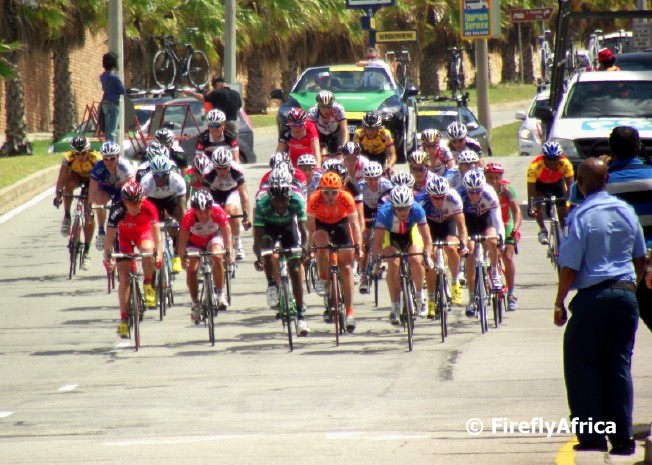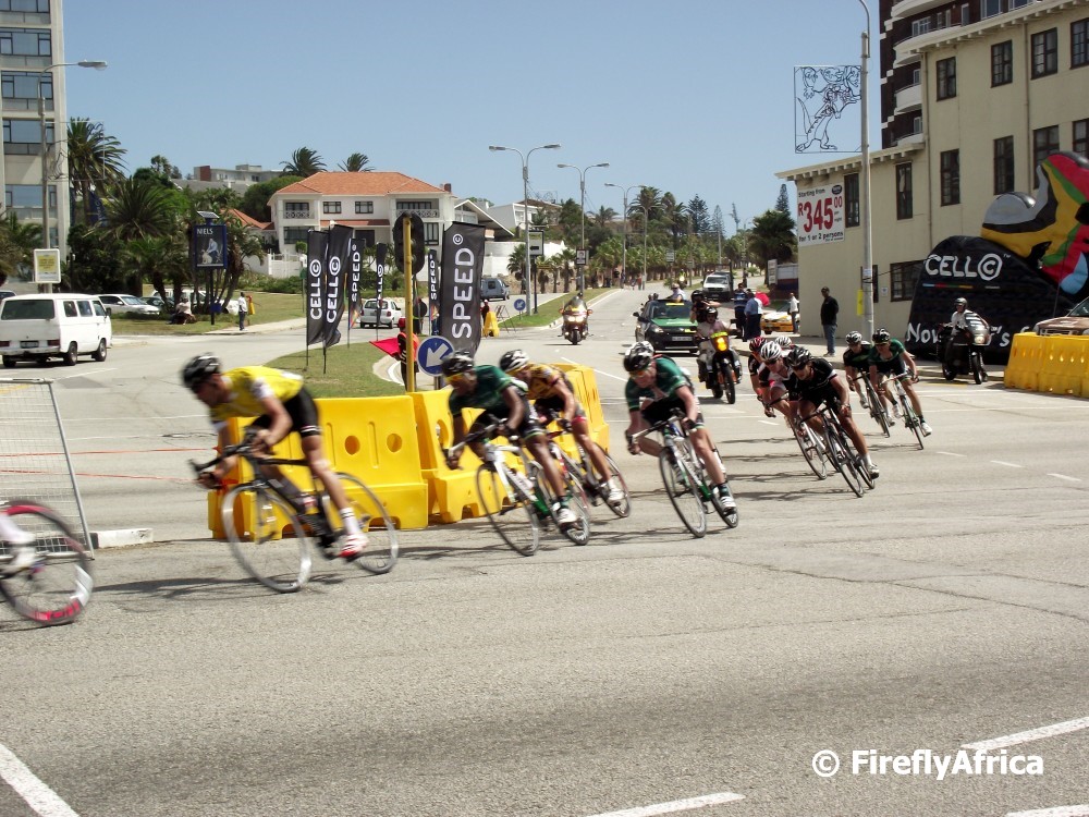 Yesterday the third leg of the Cell C Tour of South Africa cycle race took place in and around Port Elizabeth. The 177 km leg started at the Nelson Mandela Bay Stadium and took them out past Motherwell and around the Addo Elephant National Park. From there the riders headed back to the city via Colchester before tackling a couple of steep climbs around Central and South End. I was waiting for them just before the finish line at Humewood on the beachfront. We’ve been having very nice weather lately, but the wind came up on cue and decided to remind all why Port Elizabeth is also called the Windy City (how I hate that name), and the riders had the endure hot and windy conditions. The leg was won by Yohann Gene of France in 4:05:27, followed by Johann Rabie of South Africa and Gregory Habeaux of Belguim. All in all the day went of very very well and was a showcase of the city’s capabilities of hosting events like this.