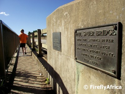 The arch bridge, also known as the Storms River Bridge, was completed in 1958 and forms a major link in the National Route N2 between George and Port Elizabeth. The bridge is one of four great arch bridges crossing the deep gorges of the Tsitsikamma and is about 120 meters high.