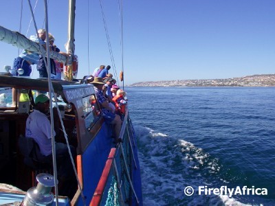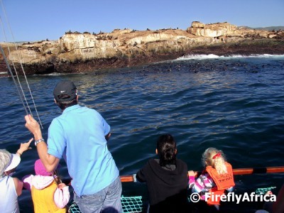 It was a stunning morning with barely a whisper of wind which meant the sea was flat and the cruise as smooth as you can imagine. The Romanza sails parallel to the coast and views from the boat include the whole curving coast line from the lighthouse at the Point to Santo Beach and Diaz Strand all the way past Hartenbos towards the Outeniqua Mountains in the background. After a smooth 20 minute we reached our turning point at Seal Island.