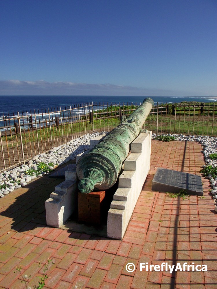 At the end of the road at Schoenmakerskop where the Sacramento Trail starts is one of the original bronze cannons that has been salvaged from the wreck site of the Sacramento.  The Sacramento was a Portuguese galleon which foundered on 30 June 1647.  The 72 survivors who reached the beach set out to walk the 1300 km back to Mozambique, with only nine reaching Delagoa Bay (Maputo) and only four surviving the journey back to Goa (Far East).  In 1977 local divers salvaged 40 bronze cannon from the wreck and this one has been set up as a monument pointing towards the wreck site.