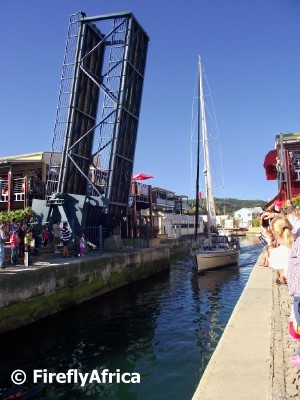 One of the highlights for kids visiting the Knysna Quays is when the walkway bridge lifts up to allow a yacht through.  When the bridge lifted up on this occasion there was a guy and his kids in a canoe coming down the canal and everybody clapped hands for him because it looked like the bridge lifted up specially for him.  The next moment this big yacht came sailing though right behind them.