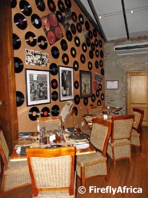 Catering for the occasion took place in the very popular Farriagers Restaurant at the hotel furnished with sea – grass chairs imported from Indonesia and hand crafted tables from Knysna. The decor is a combination of wood and modern art with interesting features like this wall full of old records. Not forgetting a very inviting fireplace on a cold evening.
