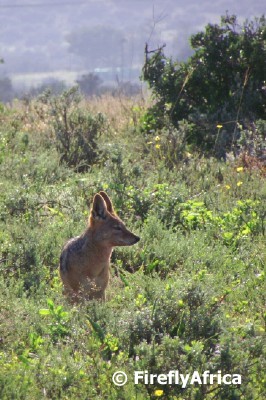 One of the smaller animals to look out for on a visit to the Addo Elephant National Park is the Black-Backed Jackal. Named for the “mantle” of black flecked with white stretching from the back of his neck to his tail, the jackal is active both during the day and at night. Their “nyaaaa-aa-aa-aa” call is probably one of the most distinctive bush sounds in Africa. This individual came trotting through the veld and paused…