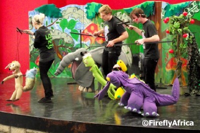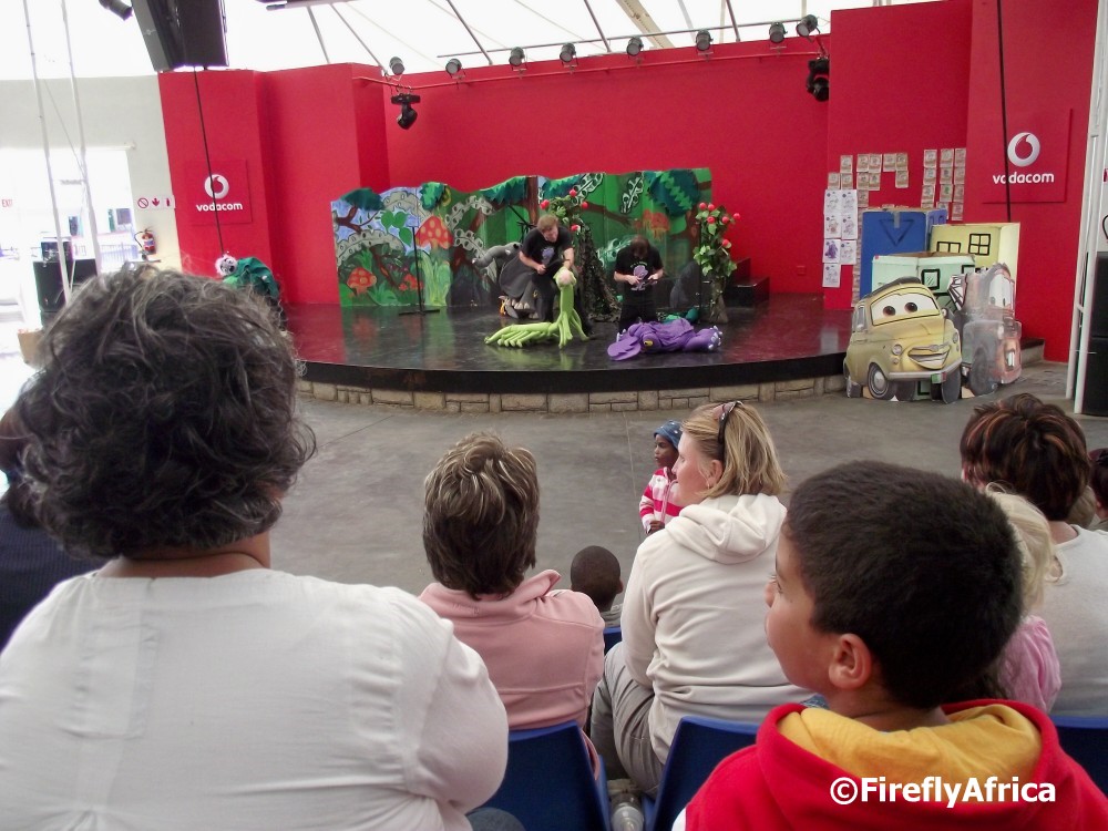 The Boardwalk is quite good with organising kids entertainment during the school holidays. On Saturday afternoon we took the Rugrats to see the Babalela show. Babalela is a character from a series of Afrikaans children’s books and the show covered the stories from all three of the books that has been published so far. Babalela is the purple face peeking out from under the leaves on the left of the stage.