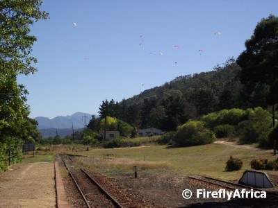Sedgefield is a very popular paragliding destination and you can often look up from town and see a number of paragliders leisurely hanging overhead. A slow (but still adrenalin filled for first timers) sport for an official Slow Town. Looking up from the Steam Whistle Stop Cafe at Sedgefield Station this was the scene with my last visit.