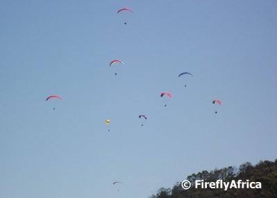 Sedgefield is a very popular paragliding destination and you can often look up from town and see a number of paragliders leisurely hanging overhead. A slow (but still adrenalin filled for first timers) sport for an official Slow Town. Looking up from the Steam Whistle Stop Cafe at Sedgefield Station this was the scene with my last visit.