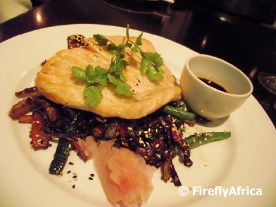 The Damselfly was a bit undecided on what to have and was uhm’ing and ah’ing about possibly having the mussels.  This is where Tyron stepped up to the plate (in a matter of speaking).  He highly recommended the Chef’s Choice for the evening.  Seared Norwegian Salmon with Asian Stir Fry and Kikkoman Sauce.  Believe me, she wasn’t sorry that she ordered it.  It wasn’t just nice, she absolutely loved it.