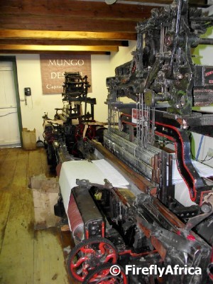 One of the buildings also contain a weaving museum. Being the only one of its kind in South Africa, this is a working museum housing 19th century power looms, sampling and producing speciality fabrics for Mungo Design, also located in the complex. The museum is open daily and there is usually somebody on hand to inform people on what they see.
