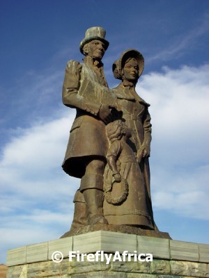 The area from Port Elizabeth eastwards, specially around Grahamstown and Bathurst, is where the British Settlers settled in 1820 (see here and here). On top of Gunfire Hill overlooking Grahamstown is the big Settlers Monument building and just down the road from it visitors will find the British Settlers Family statue. The statue depicts a settler family as they would have looked on their arrival in Algoa Bay.