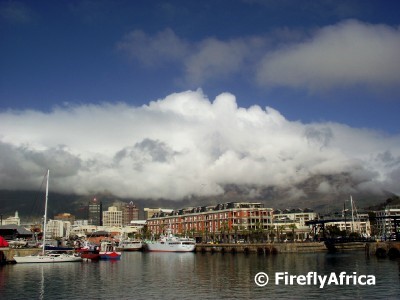 The two pictures show just some of the moods of Table Mountain. The first one on a rainy day and the second (which was taken the very next day) with lots of clouds covering it. Both pictures were taken from the V&A Waterfront.