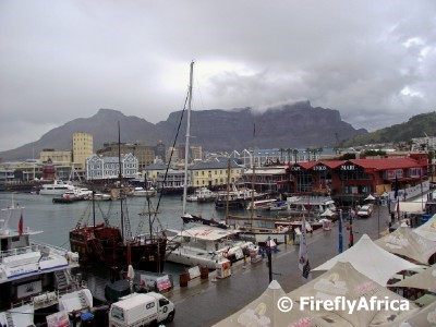 The two pictures show just some of the moods of Table Mountain. The first one on a rainy day and the second (which was taken the very next day) with lots of clouds covering it. Both pictures were taken from the V&A Waterfront.