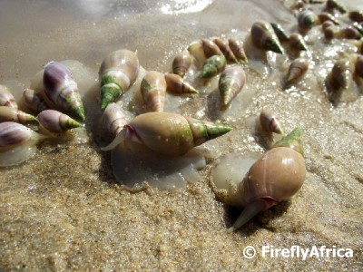 I’ve posted about Plough Shells before (here and here) but I can never get enough of these very interesting creatures living in the sand below the high and low tide mark. On a visit to Dana Bay near Mossel Bay in the Western Cape we found literally hundreds of them feeding on a dead jelly fish.