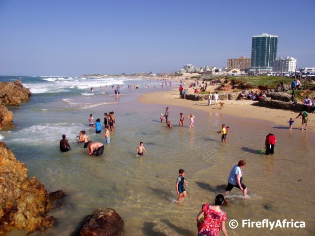 When we were small we spent many Sundays splashing in the natural “tidal pool” behind the big rock at Pollok Beach and passing there the other day it seems that not much has changed. We may have grown up, but another generation of kids now swim there. I’ve never been very sure where the name Pollok Beach (often mistakenly spelled Pollock Beach) comes from. I found the explanation on the Port Elizabeth surf website Millers Local. Pollok Beach was named after the Pollok Hotel that used to stand where the present Summerseas (the buildings with the greenish roofs in the middle of the picture) is today. The Pollok Hotel later became the old Summerstrand Hotel. The original building dated back to the 1890’s, when the sand dunes were reclaimed and allocated for use of a hotel. The hotel was built by a guy called Pollok who built it came from Scotland and named the hotel after himself.