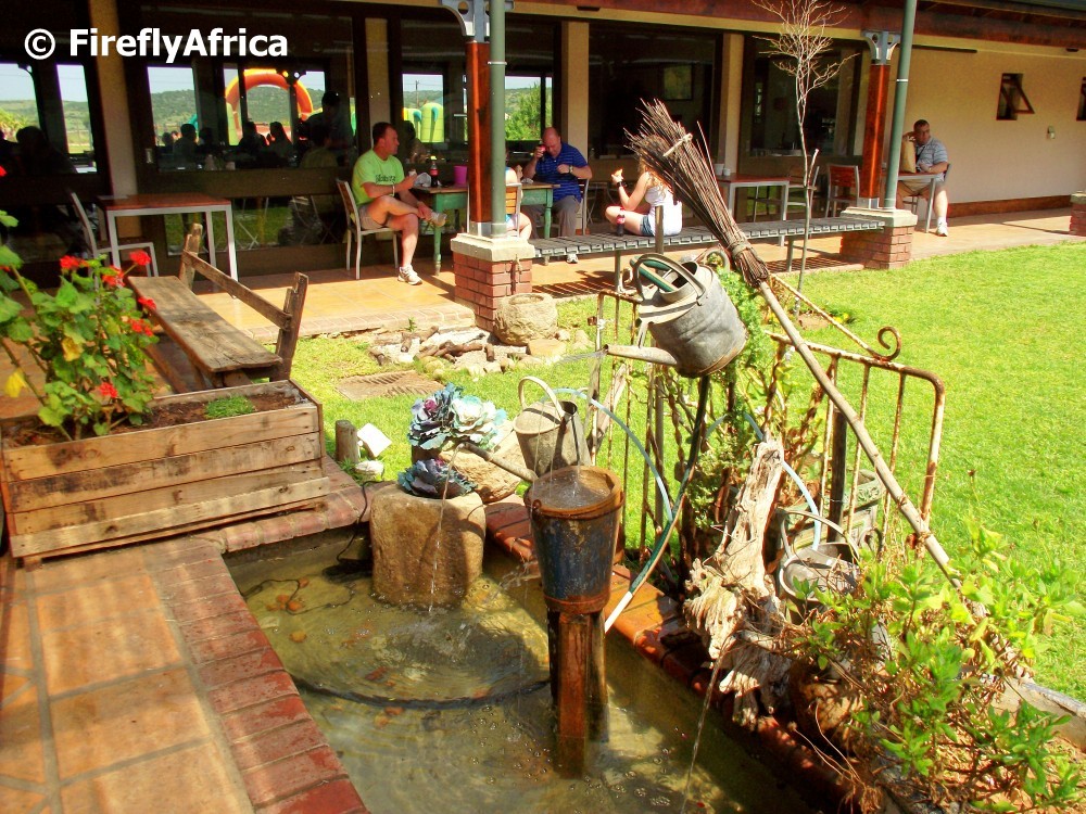 The inside of the Nanaga farm stall outside Port Elizabeth has a big grass courtyard with the shop to the one side and the restaurant to the other. Although there are some people who prefer to sit down and be served a meal, most people just buy a pie or roosterkoek and something to drink from the shop. In the background a couple of travellers are enjoying their Nanaga homemade pies in the relaxed environment of the courtyard.