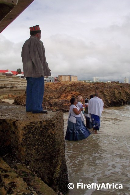 Life has a tendency to throw little surprises your way every now and then. I was accompanying a journalist from Argentina around Port Elizabeth for five days and as we were walking along Shark Rock Pier at Hobie Beach I spotted a couple of people next to the pier on the water’s edge performing some kind of ceremony.