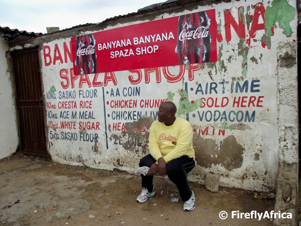Last week I had the opportunity to go on a township tour with Luvu Ndima of Jama Tours. I haven’t been on one for a while and going on this one gave me lots of photo opportunities. What makes Luvu’s tours stand out is that he doesn’t just drive through the township showing you the sights through the vehicle windows. We stopped numerous times to getting a closer look at things like an informal butcher, a corner “take away”, a tavern with a buy and braai option, a barber shop and all the vendors around Njoli Square. Here Luvo offered to pose in front of this very interesting spaza shop wall.