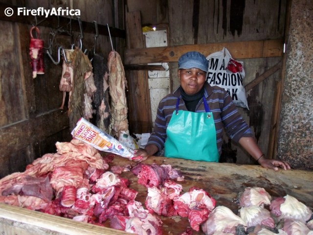 There is always something new and interesting to see around the next corner for somebody from the suburbs when visiting a township.  This is even more so the case when you have a camera in hand and looking for those unusual photos to post.  Although there are many of these around the townships, I have a particular butcher / take-away that I like to pop by (to look, not to buy from) when I’m visiting the Red Location Museum.  Just down the road from the museum a couple of pots are cooking away in anticipation of the lunch time or going home crowd to come by and purchase a meal.  The contents of the pots range from chicken pieces and chicken heads & feet to cow liver and offal.