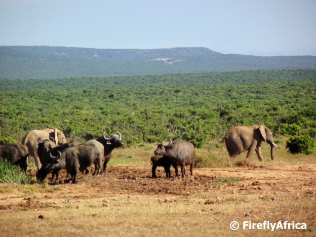 Visitors to the Addo Elephant National Park often go home with stories of magnificent elephant sightings and sometimes have an awesome story to tell of how an elephant walked so close past their car that you could reach out and touch him (just don’t actually go and do it). On a good day you could also tick buffalo, lion and perhaps even black rhino off your “spotting the Big 5 list”, but not often can one say that you had more than one of the Big 5 in one place. I had a very fortunate day in Addo recently and one of the highlights was having both elephant and Cape buffalo at the same waterhole.