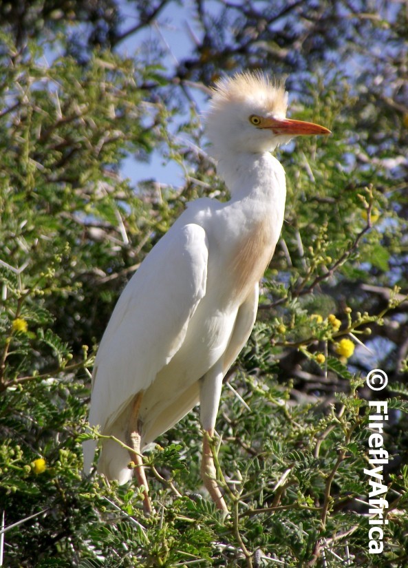 A cattle egret sitting in a sweet thorn tree at the Leidam in Montagu.
