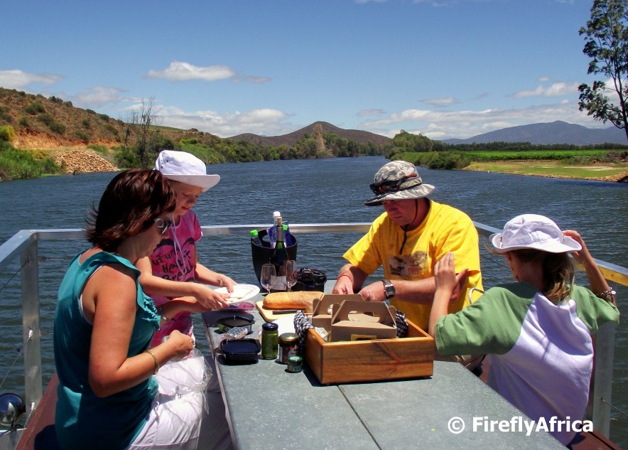 I think the most innovative idea that goes along with the cruise is the fact that passengers get given a “Create a picnic basket” menu containing items from the deli on check-in at the wine estate. As you board you get given your picnic basket and wine to take on board. As we were going for lunch after the cruise we didn’t order anything to eat, but the family next to us did I got the opportunity to take a snap of them tucking in.