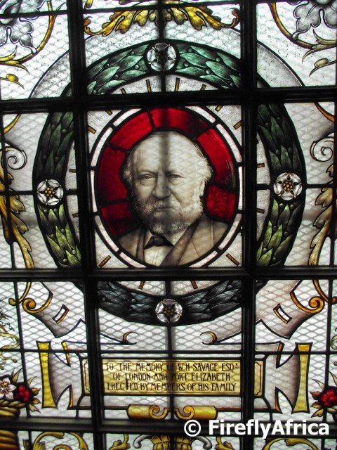 One of the stained glass windows in the historic Public Library in the Port Elizabeth city centre shows the picture of Mr WH Savage. I Googled the name but couldn’t find much and then turned to Margaret Harradine’s Port Elizabeth, A social chronicle to the end of 1945. William Savage was born in Kent in 1824 and came to Port Elizabeth in 1849. He had a business selling stationary and hardware and was a generous benefactor of several good causes both in Port Elizabeth and in Grahamstown. The library’s Savage Memorial Hall was also named after him.