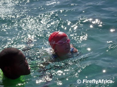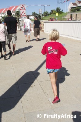 As soon as she was out the water she had her shoes and t-shirt on and off she went on her 1,2km run to the finish line at Hobie Beach.  Every 50 meters on the run there were both schoolgirls as well as SA Defence Force volunteers keeping an eye on the kids and encouraging them.  I met Drama Princess just as she came up the ramp from the pool and kinda struggled to keep up with a camera in one hand, video camera in the other and a backpack on.  Watching the video afterwards you could here me huffing and puffing which is a bit embarrassing having my 7 year old daughter show me up like that.  She’s already said that she wants to take part again next year.  Now to just persuade Chaos Boy to try it as well.