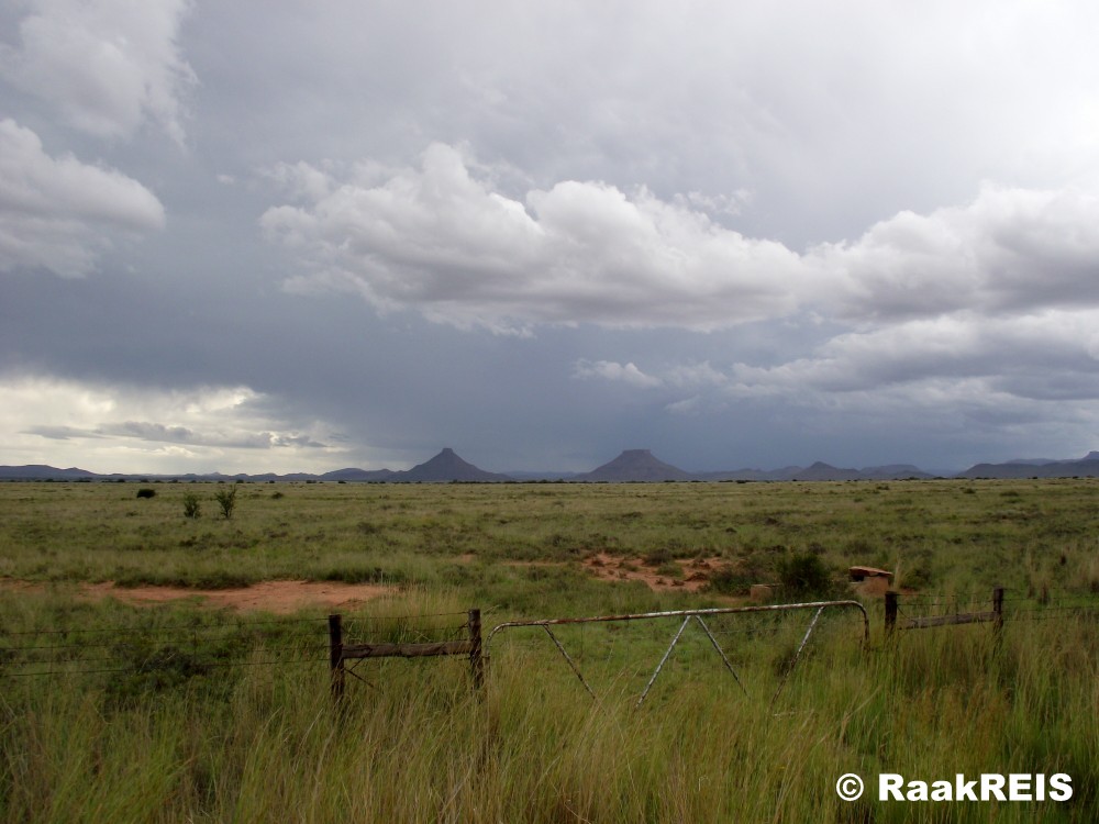Party mense vind die baie vervelig om deur die Karoo te reis, maar vir meeste het die groot ooptes met die weie blou hemel bokant ‘n spesiale aantrekking. Na ‘n warm somers dag kan ‘n donderstorm baie gou opsteek soos hier net buite Steynsburg in the Ooskaap. Die twee Karookoppies in die agtergrond is Teebus en Koffiebus omtrent 10km buite die dorp. Die “bus” is blykbaar ou Nederlands vir pot en die naam kom van die feit dat hulle soos ‘n teepot en koffiepot in die verte lyk. Teebus aan die linkerkant is die smaller een van die twee koppies terwyl Koffiebus breër is.