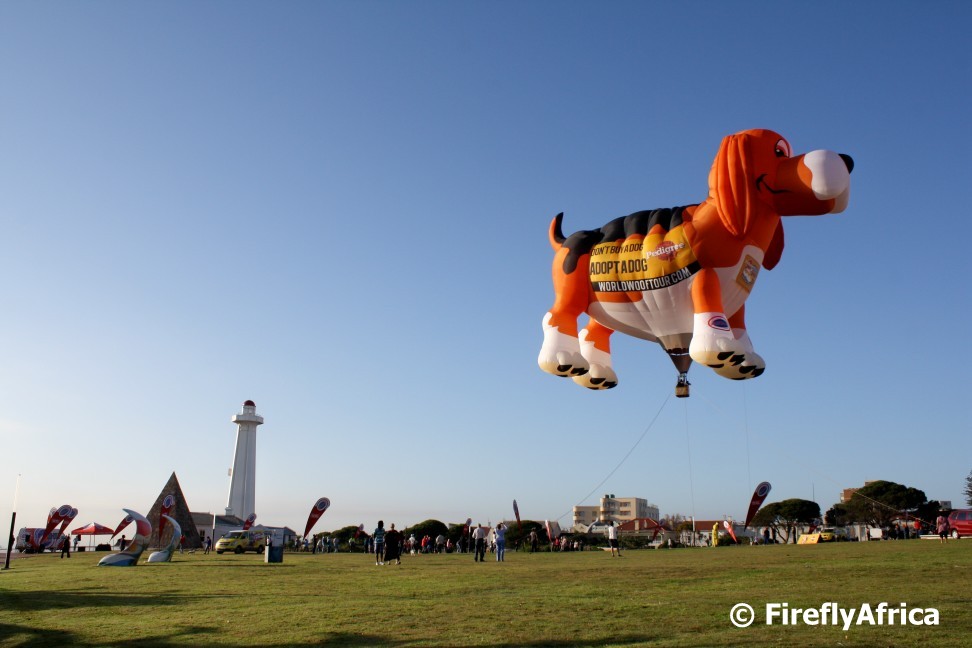 In 2009 Oscar the mix breed mutt was sitting on death row at the SPCA in Cape Town and had his lucky break by getting adopted one day before being put down.  Since then Oscar has become the world’s most widely travelled dog.  He had travelled over 200 000 all over and around the world and has visited most of the world’s well know landmarks, probably lifting his leg against most of them.  Through his travelers Oscar is bringing the plight of all homeless dogs all over the world to the fore and helps to encourage people wanting a dog to rather adopt one from their local animal welfare organisation.  Oscar is currently travelling through South Africa along with Oscar Maximus, the world’s biggest dog.  Oscar Maximus, a 30m wide and 30m high hot air balloon, was floating above the Donkin Reserve this morning on their visit to Port Elizabeth.