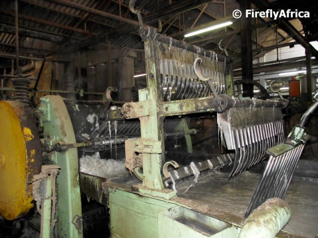 The washing, or scouring, process of the mohair is straight forward yet seemingly very complicated. The machine doing the washing looks like a bunch of spider or crab legs combing the mohair through the water before it gets blown dry. The reason for the washing is to remove all excess dirt and oils.