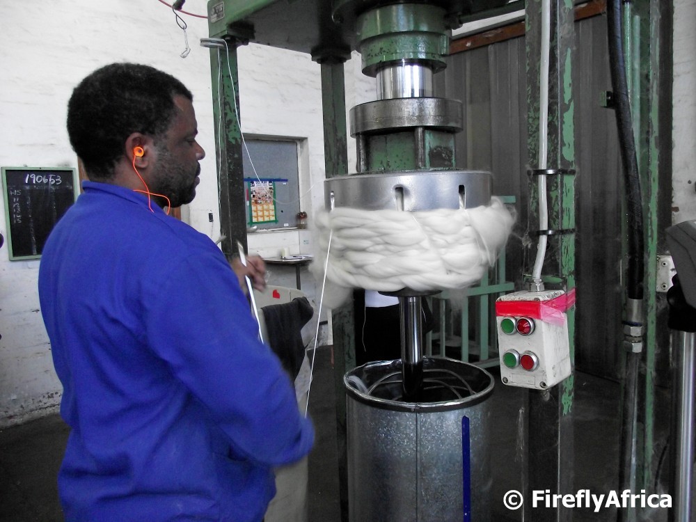 After the washing and drying process the combing process removes the remaining vegetable matter and shorter and irregular sized fibres. This transforms the mohair into a soft mohair “top”. Some of the mohair gets shipped off to buyers around the world while others move through the next process of spinning the yarns. After the combing process the mohair that is due to be shipped off gets tied in bundles and packed in small bales. This guy was busy tying the bundles and I was very impressed with the way he was handling that big “needle” in his hand.