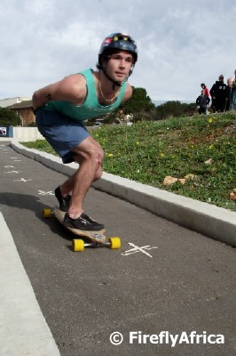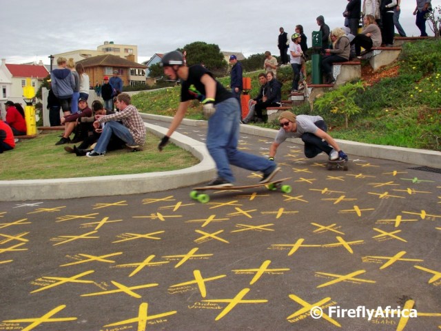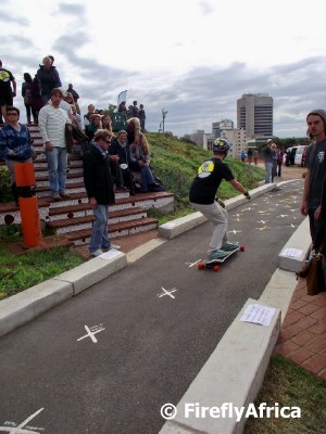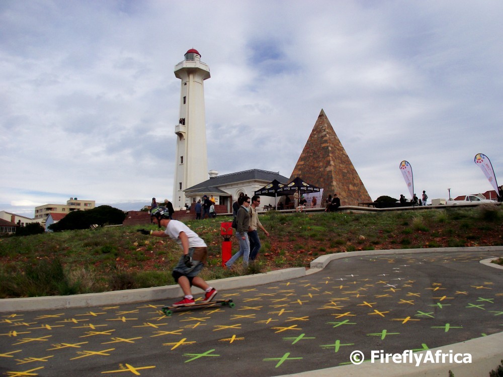 One of the things that the redevelopment of the Donkin Reserve in Port Elizabeth has done was inadvertently create the ideal winding downhill skateboard (long board) coarse.  This has led to the first Donkin Downhill Dash taking place today.  The pathway, starting up at the historic lighthouse and pyramid with its crosses representing democratic votes past and future, makes its way down towards Chapel Street and are long enough for the top skaters to clock times of about 1 minute 22 seconds.