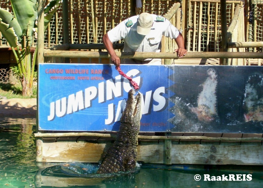 Die Kango Wildlife Ranch in Oudtshoorn het ‘n lang pad gekom van die dae toe dit net ‘n krokodilplaas was. Alhoewel daar deesdae baie ander dinge is om te sien by hierdie bekende attraksie speel krokodille nog altyd ‘n rol. By die Springende Kake (Jumping Jaws) word die krokodil uit die water uit gelok met ‘n stuk vleis. Hy spring letterlik halflyf uit om die vleis te vat en terwyl dit gebeur staan besoekers met opgehoue asems om te sien of die gids darem met altwee sy arms gaan terugkom.