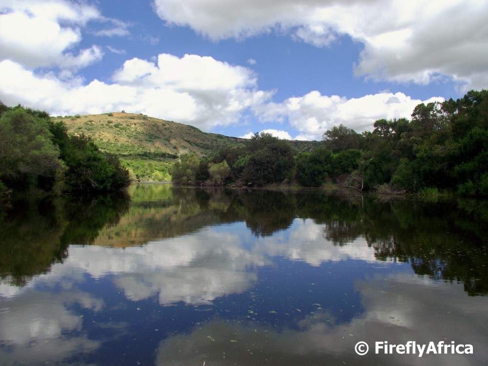 I little while ago I joined a couple of tourist guides from Port Elizabeth on a visit to Amakhala Game Reserve about 75 km east of the city.  Although we got to do a game drive we were actually there to see their new boat and to go for a short cruise on the Bushmans River which flows through the reserve.  As we were cruising upstream this reflection presented itself for a photograph and I just couldn’t say no.