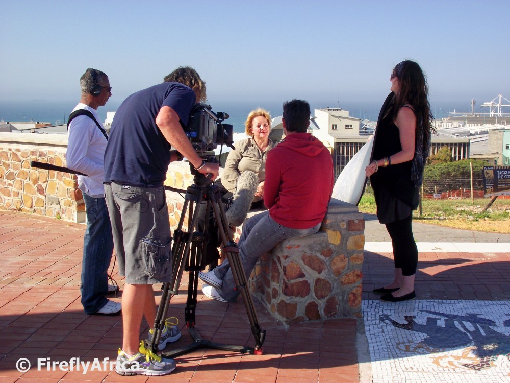 Last week the crew from the SABC 2 Afrikaans magazine program Pasella was in Port Elizabeth to shoot a couple of stories. The one story involved vintage cars and a bit of history of Port Elizabeth. I needed to organise them somebody to interview regarding the Donkin Reserve and as I have been on Pasella before with regards to this same subject I needed to get them somebody else. I asked my colleague Mathilda and she hesitantly accepted, although getting a bit more excited after hearing that the presenter for the insert would be ex – Mr South Africa and popular Pasella presenter Dieter Voigt. Here Mathilda is getting a few seconds of fame during the shoot.
