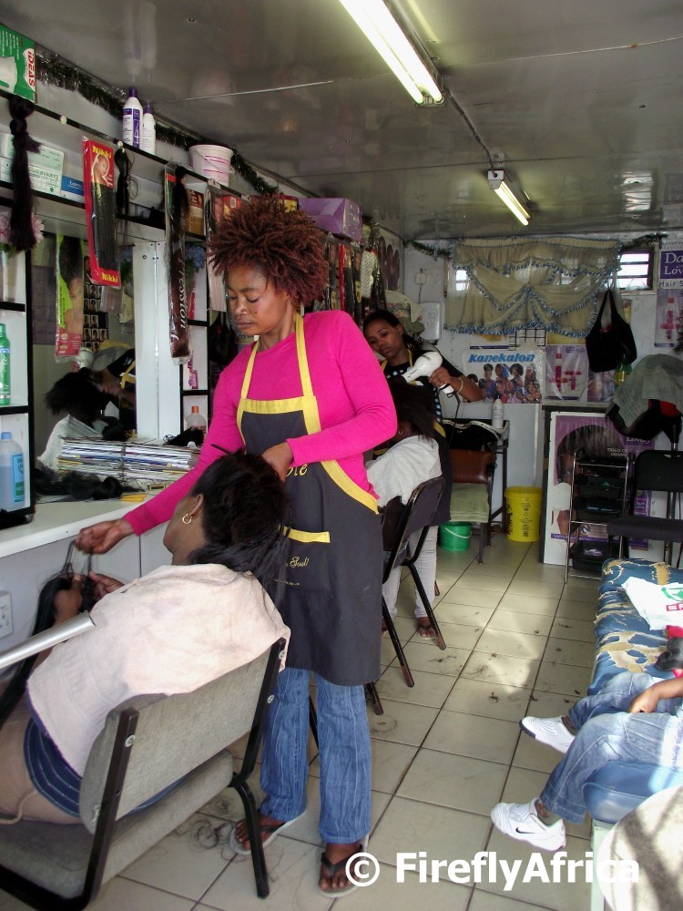 Hair salons in the township is a dime a dozen yet its apparently a very good business to be in and they all make a decent living.  I took a peek into one of the containers (and with containers I really mean most of them operate from shipping containers) in New Brighton the other day and was pleasantly surprised to see how well it was kitted out.  One wouldn’t think its housed inside a container.  The hair dresser was busy putting extensions into the customer’s hair and were still going to braid her hair later on.