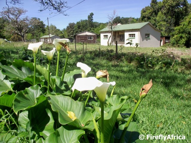 Lilies growing along Oak Lane in Storms River Village in the Tsitsikamma with some of the old forestry houses (now under the control of SA National Parks) in the background.  Beyond the houses is the Tsitsikamma forest and in particular the Plaatbos section.