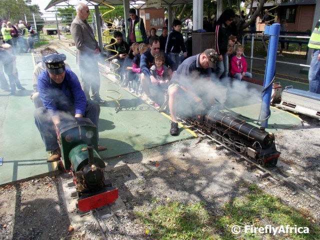 On the first Sunday of the month families with young children (mostly but definitively not exclusively) flock to the Port Elizabeth Model Locomotive Society’s venue in Fernglen to ride these beautiful little trains.  It only costs R6 per person for a ride which will take you around the yard on a couple of loops, through a tunnel and over the Great Grass River bridge.  There are both miniature diesel as well as steam trains and here two of the steam loco’s are taking on passengers and getting ready for a spin.