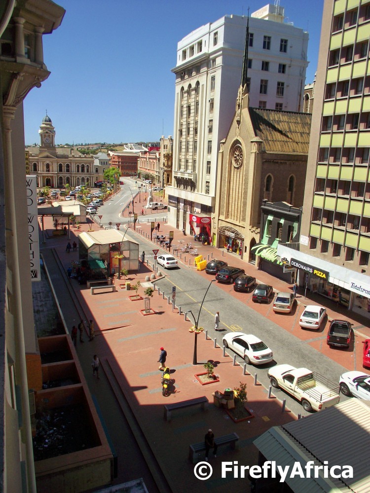 The view down onto Govan Mbeki Road (Main Street) from the third floor of the historic Fisher’s Building in downtown Port Elizabeth.  The St Mary’s Cathedral is in the centre of the picture and the City Hall on the left.