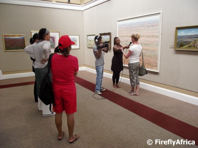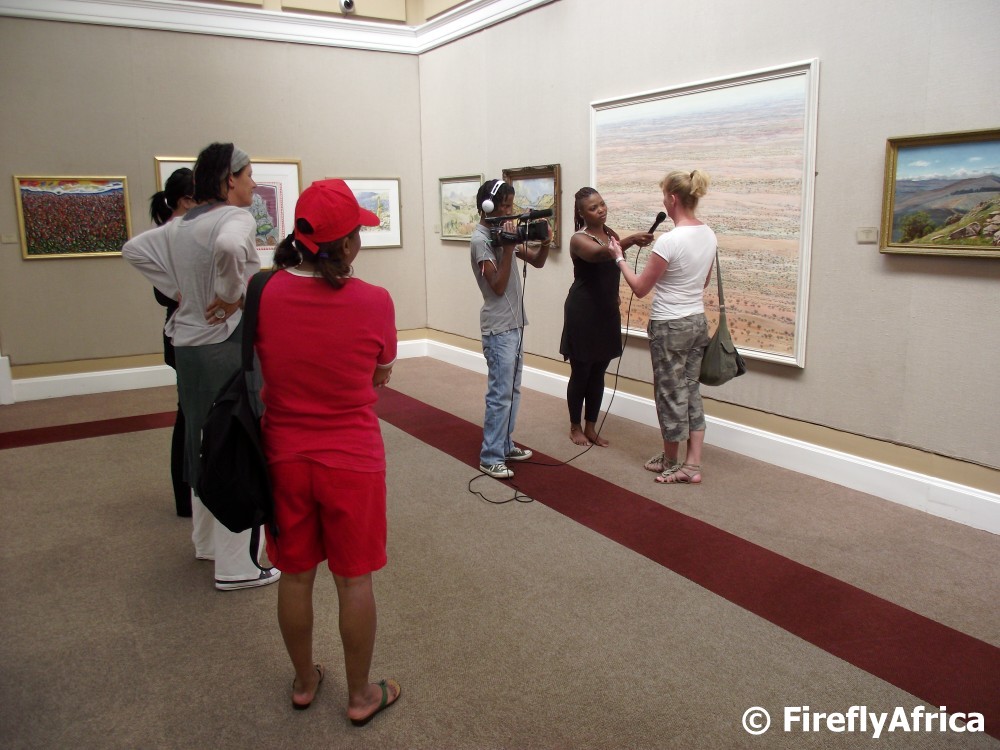 I was part of a very delightful and well supported art walk which visited a number of art galleries around Central. The Eye on Art television crew accompanied us on the walk to film it as an insert. Eye on Art is a weekly interactive, lifestyle magazine show on Bay TV, specialising on the art scene through the artist’s eye. It broadcasts on Saturdays at 17:30 with repeats on Sundays at 12.30pm, Tuesdays at 7pm & Wednesdays at 11am. Bay TV can be seen free to air around Nelson Mandela Bay and on Dstv (Channel 260). Here they are interviewing on of the ladies who went on the walk at the Nelson Mandela Metropolitan Art Museum.