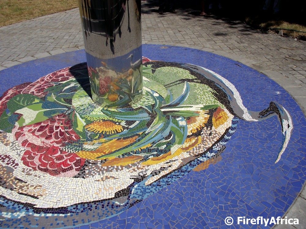In front of the newly refurbished Athenaeum building is what I find to be one of the most interesting art pieces on Route 67. The mosaic piece is called Harmony in Nature and is an anamorphic cylinder art piece. On the mosaic itself the picture which represents the animals and flowers of the Eastern Cape looks all squashed up but when you look at it in the cylinder’s reflection it makes a perfect 3D picture.