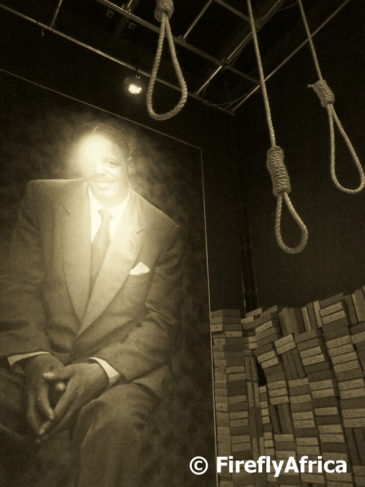 One of the Memory Boxes in the Red Location Museum is dedicated to Vuyisile Mini, one of the first African National Congress members to be executed by apartheid South Africa. The space contains three nooses representing those that he was hung on along with Wilson Khayinga and Zinakile Mkaba.