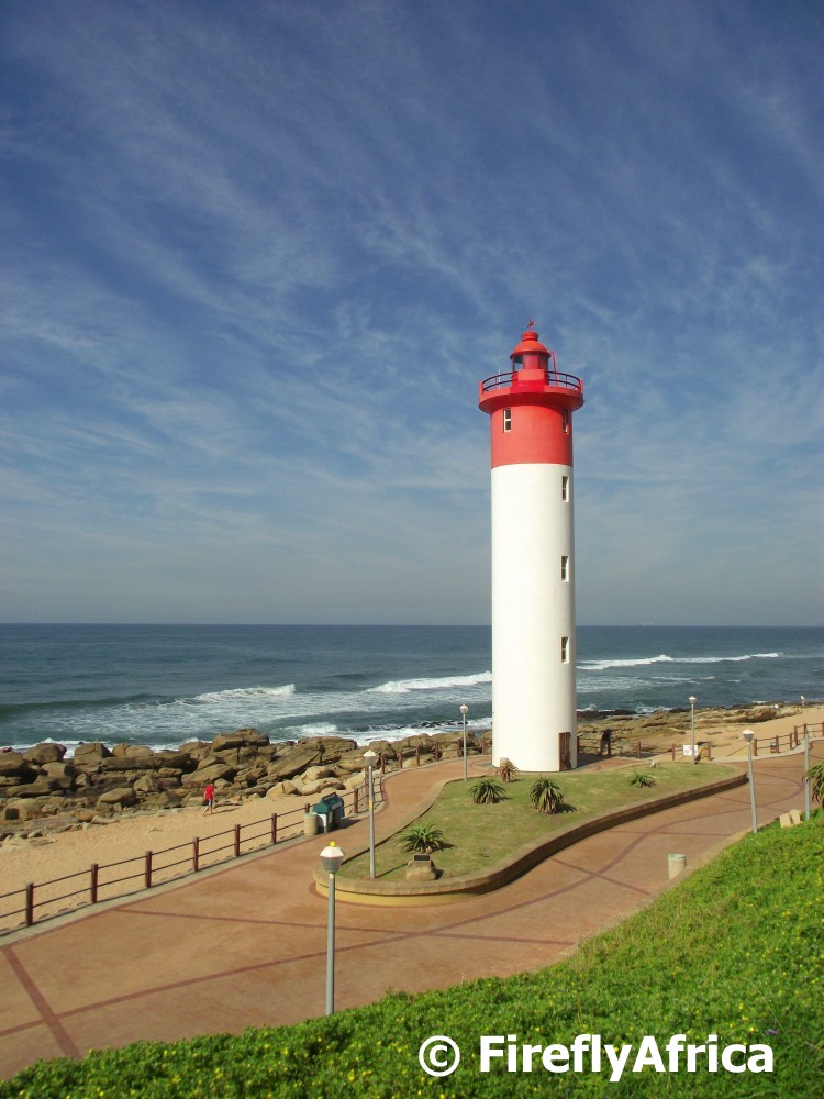 The 21 meter tall red and white Umhlanga Lighthouse is probably the best known lighthouse on the KwaZulu Natal coastline.  Umhlanga Rocks is situated on what was originally part of the sugar estate of Sir Marshall Campbell and means Place of Reeds in the Zulu language.  This refers to the beds of reeds that accumulate on the banks of the Ohlanga River a few kilometres north of town.  Incidentally Sir Marshall was also the person who introduced the colourful rickshaws to Durban’s beachfront.  When a track was made from Mount Edgercombe to Umhlanga Rocks, the area became popular with local farmers who leased small plots on the shoreline to built vacation cottages.  From there it developed into the popular seaside resort it is today.